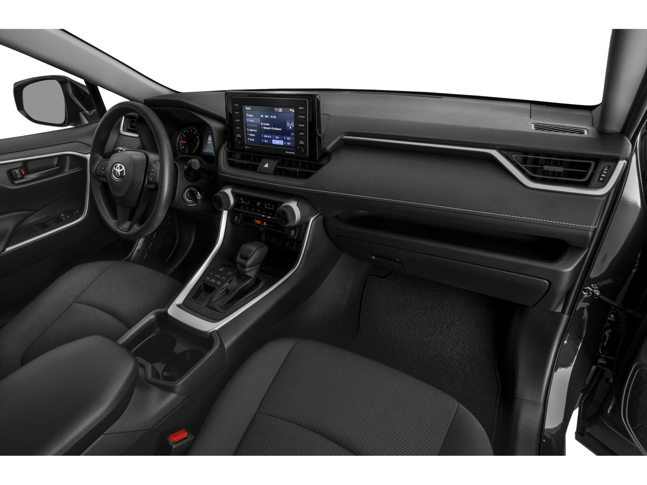 This 2020 Toyota RAV4 comes nicely equipped with Black Cloth, 17 Steel Wheels, 4-Wheel Disc Brakes, 6 Speakers, ABS brakes, Air Conditioning, AM/FM radio: SiriusXM, AM/FM Stereo, Apple CarPlay/Android Auto, Auto High-beam Headlights, Axle Ratio: 3.177, Brake assist, Bumpers: body-color, Driver door bin, Driver vanity mirror, Dual front impact airbags, Dual front side impact airbags, Electronic Stability Control, Emergency communication system: Entune Safety Connect, Exterior Parking Camera Rear, Fabric Seat Trim, Four wheel independent suspension, Front anti-roll bar, Front Bucket Seats, Front Center Armrest, Front reading lights, Illuminated entry, Knee airbag, Low tire pressure warning, Occupant sensing airbag, Outside temperature display, Overhead airbag, Overhead console, Panic alarm, Passenger door bin, Passenger vanity mirror, Power door mirrors, Power steering, Power windows, Radio data system, Rear anti-roll bar, Rear seat center armrest, Rear window defroster, Rear window wiper, Remote keyless entry, Roof rack: rails only, Speed control, Speed-sensing steering, Split folding rear seat, Spoiler, Steering wheel mounted audio controls, Tachometer, Telescoping steering wheel, Tilt steering wheel, Traction control, and Trip computer.