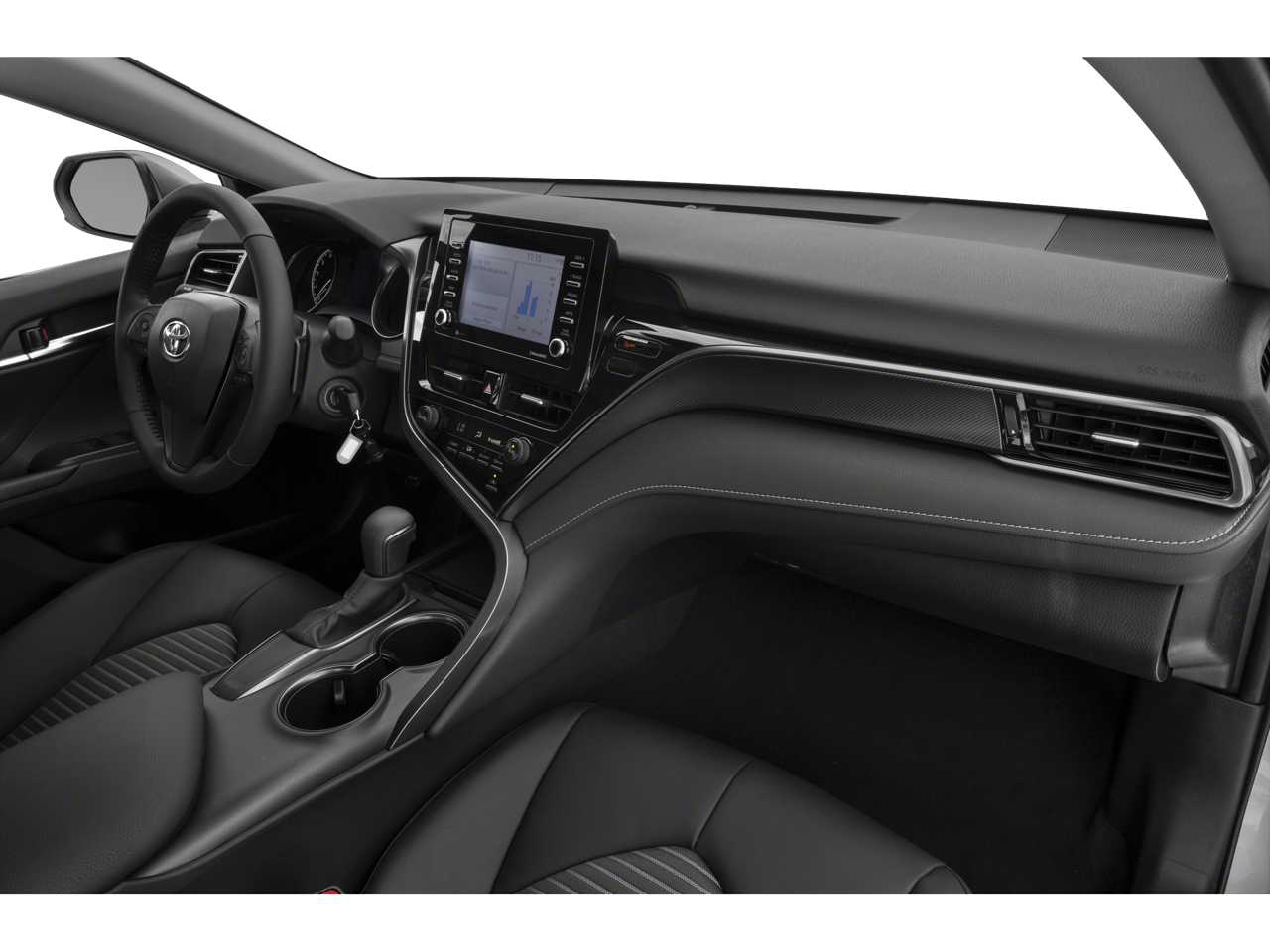 This 2021 Toyota Camry comes nicely equipped with Macadamia Cloth, 4-Wheel Disc Brakes, 6 Speakers, ABS brakes, Air Conditioning, Alloy wheels, AM/FM radio: SiriusXM, Apple CarPlay/Android Auto, Auto High-beam Headlights, Automatic temperature control, Brake assist, Bumpers: body-color, Delay-off headlights, Driver door bin, Driver vanity mirror, Dual front impact airbags, Dual front side impact airbags, Electronic Stability Control, Emergency communication system: Safety Connect with 1-year trial, Exterior Parking Camera Rear, Fabric Seat Trim w/Sport SofTex, Four wheel independent suspension, Front anti-roll bar, Front Bucket Seats, Front Center Armrest, Front reading lights, Fully automatic headlights, Illuminated entry, Knee airbag, Low tire pressure warning, Occupant sensing airbag, Outside temperature display, Overhead airbag, Overhead console, Panic alarm, Passenger door bin, Passenger vanity mirror, Power door mirrors, Power driver seat, Power steering, Power windows, Radio data system, Radio: AM/FM Audio System, Rear anti-roll bar, Rear seat center armrest, Rear side impact airbag, Rear window defroster, Remote keyless entry, Security system, Speed control, Speed-sensing steering, Split folding rear seat, Spoiler, Steering wheel mounted audio controls, Tachometer, Telescoping steering wheel, Tilt steering wheel, Traction control, Trip computer, Variably intermittent wipers, and Wheels: 8.0J x 18 Black Machined-Finish Alloy.