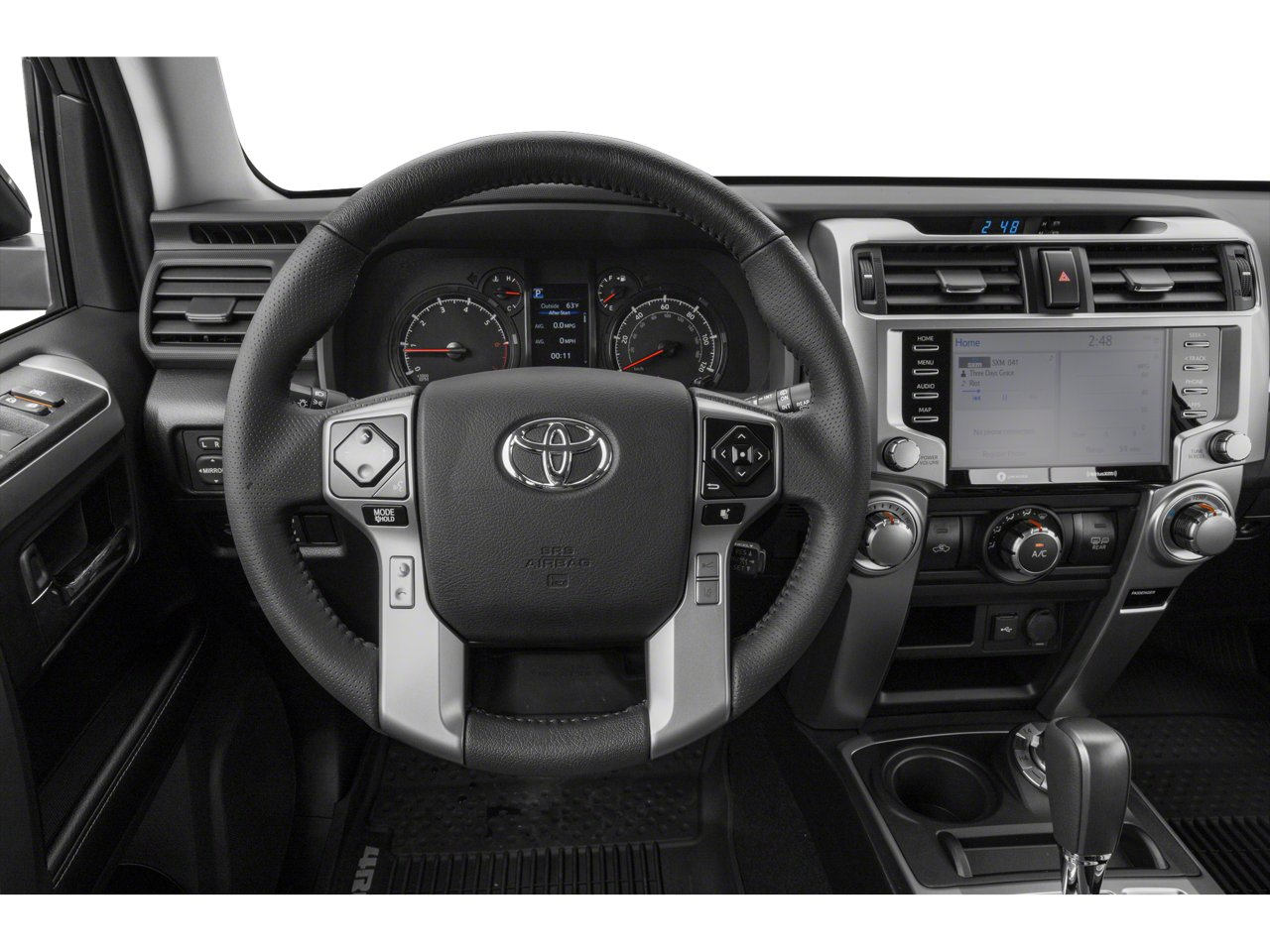 This 2022 Toyota 4Runner comes nicely equipped with 4WD, Black/Graphite w/Leather Seat Trim, 17 6-Spoke Alloy Wheels, 3.727 Axle Ratio, 4-Wheel Disc Brakes, 8 Speakers, ABS brakes, Air Conditioning, Alloy wheels, AM/FM radio: SiriusXM, Anti-whiplash front head restraints, Apple CarPlay/Android Auto, Auto High-beam Headlights, Auto-dimming Rear-View mirror, Blind Spot Monitor (BSM), Brake assist, Bumpers: body-color, Compass, Driver door bin, Driver vanity mirror, Dual front impact airbags, Dual front side impact airbags, Electronic Stability Control, Emergency communication system: Safety Connect with 1-year trial, Exterior Parking Camera Rear, Front anti-roll bar, Front Bucket Seats, Front Center Armrest, Front fog lights, Front reading lights, Front wheel independent suspension, Garage Door Opener, Garage door transmitter: HomeLink, Heated door mirrors, Heated Front Bucket Seats, Heated front seats, Illuminated entry, Knee airbag, Leather Shift Knob, Leather steering wheel, Low tire pressure warning, Occupant sensing airbag, Outside Rear View Mirror, Outside temperature display, Overhead airbag, Overhead console, Panic alarm, Passenger door bin, Passenger vanity mirror, Power door mirrors, Power driver seat, Power passenger seat, Power steering, Power windows, Radio: Premium Audio w/Dynamic Navigation, Rear anti-roll bar, Rear seat center armrest, Rear window defroster, Rear window wiper, Remote keyless entry, Roof rack: rails only, Security system, SofTex Seat Trim, Speed control, Speed-sensing steering, Split folding rear seat, Spoiler, Steering wheel mounted audio controls, Tachometer, Telescoping steering wheel, Tilt steering wheel, Traction control, Trip computer, Turn signal indicator mirrors, and Variably intermittent wipers.