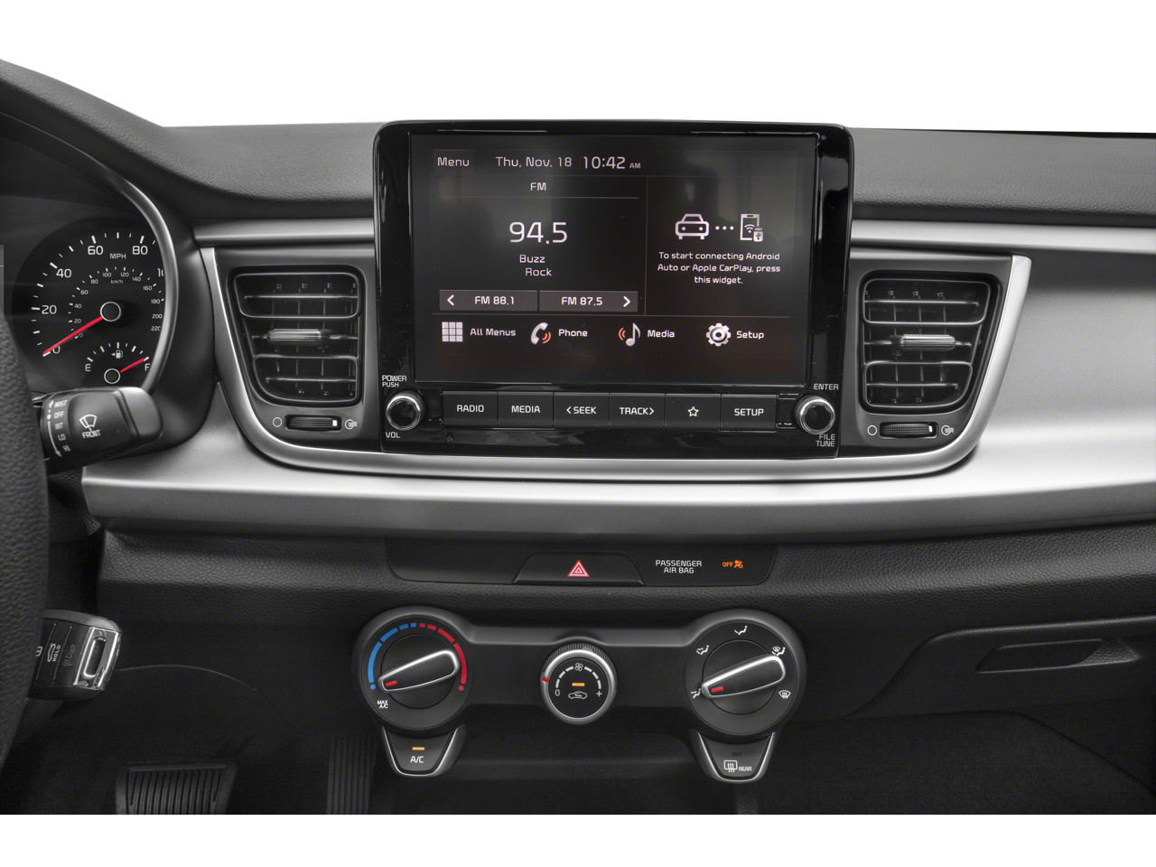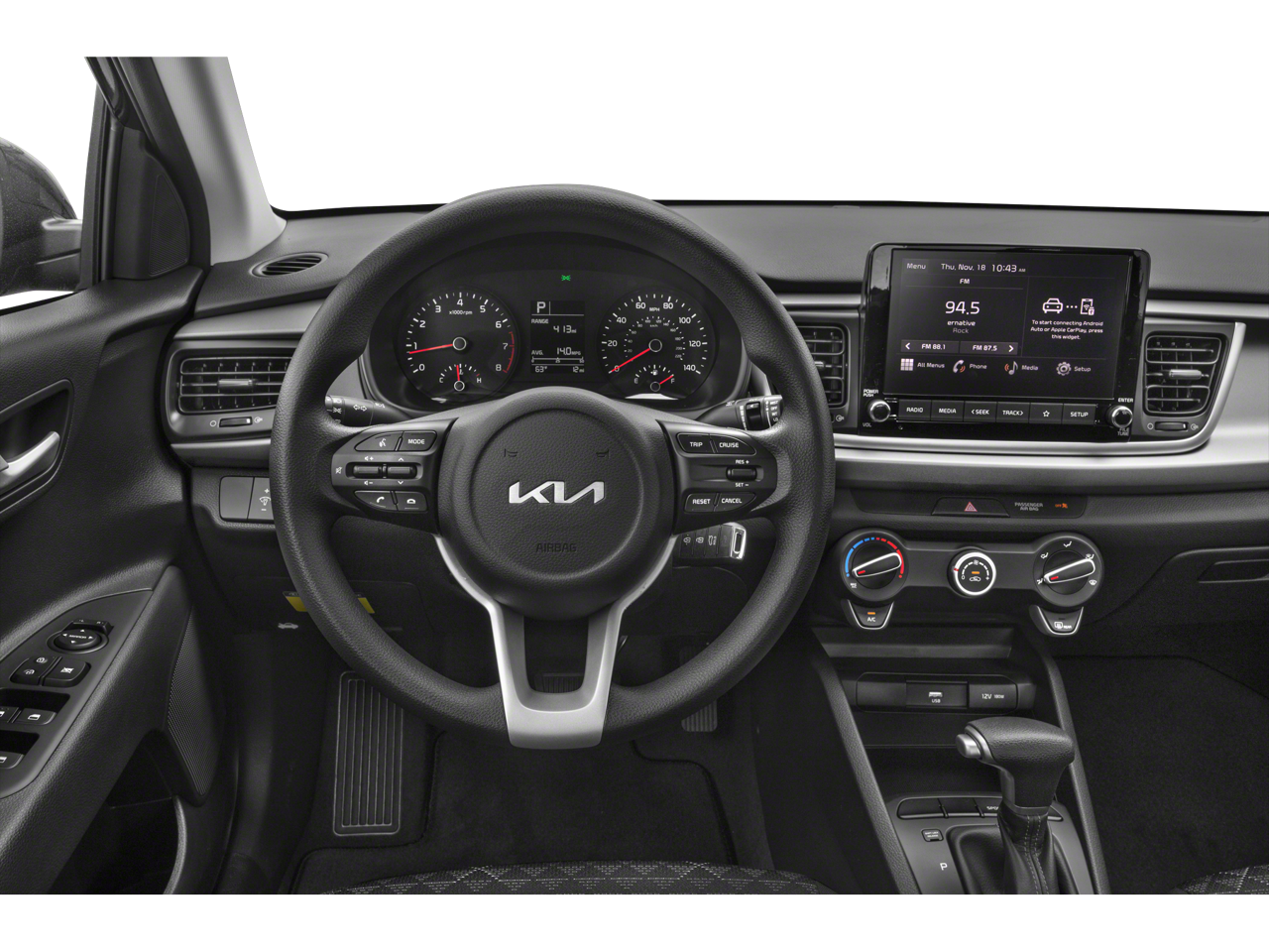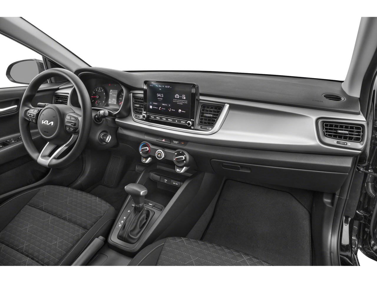 This 2023 Kia Rio comes nicely equipped with Black Cloth, 6 Speakers, ABS brakes, Air Conditioning, AM/FM radio, Brake assist, Bumpers: body-color, Driver door bin, Driver vanity mirror, Dual front impact airbags, Dual front side impact airbags, Electronic Stability Control, Front anti-roll bar, Front Bucket Seats, Front Center Armrest, Front reading lights, Front wheel independent suspension, Fully automatic headlights, Heated door mirrors, Illuminated entry, Low tire pressure warning, Occupant sensing airbag, Outside temperature display, Overhead airbag, Overhead console, Panic alarm, Passenger door bin, Passenger vanity mirror, Power door mirrors, Power steering, Power windows, Radio: AM/FM/MP3 Audio System, Rear window defroster, Remote keyless entry, Speed control, Speed-sensing steering, Split folding rear seat, Steering wheel mounted audio controls, Tachometer, Tilt steering wheel, Traction control, Trip computer, Variably intermittent wipers, Wheels: 15 x 5.5J Steel w/Full Covers, and Woven & Tricot Cloth Seat Trim.