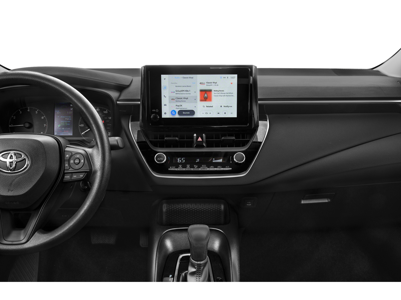 This 2023 Toyota Corolla comes nicely equipped with 4-Wheel Disc Brakes, 6 Speakers, ABS brakes, Air Conditioning, AM/FM radio: SiriusXM, Auto High-beam Headlights, Automatic temperature control, Brake assist, Bumpers: body-color, Delay-off headlights, Driver door bin, Driver vanity mirror, Dual front impact airbags, Dual front side impact airbags, Electronic Stability Control, Emergency communication system: Safety Connect (up to 10-year trial subscription), Exterior Parking Camera Rear, Front anti-roll bar, Front Bucket Seats, Front Center Armrest, Front reading lights, Front wheel independent suspension, Fully automatic headlights, Illuminated entry, Knee airbag, Low tire pressure warning, Occupant sensing airbag, Outside temperature display, Overhead airbag, Panic alarm, Passenger door bin, Passenger vanity mirror, Power door mirrors, Power steering, Power windows, Premium Fabric Seat Trim, Radio data system, Radio: 8 Toyota Audio Multimedia, Rear anti-roll bar, Rear seat center armrest, Rear side impact airbag, Rear window defroster, Remote keyless entry, Speed control, Split folding rear seat, Steering wheel mounted audio controls, Tachometer, Telescoping steering wheel, Tilt steering wheel, Traction control, Trip computer, Variably intermittent wipers, and Wheels: 16 Wide Vent Steel.