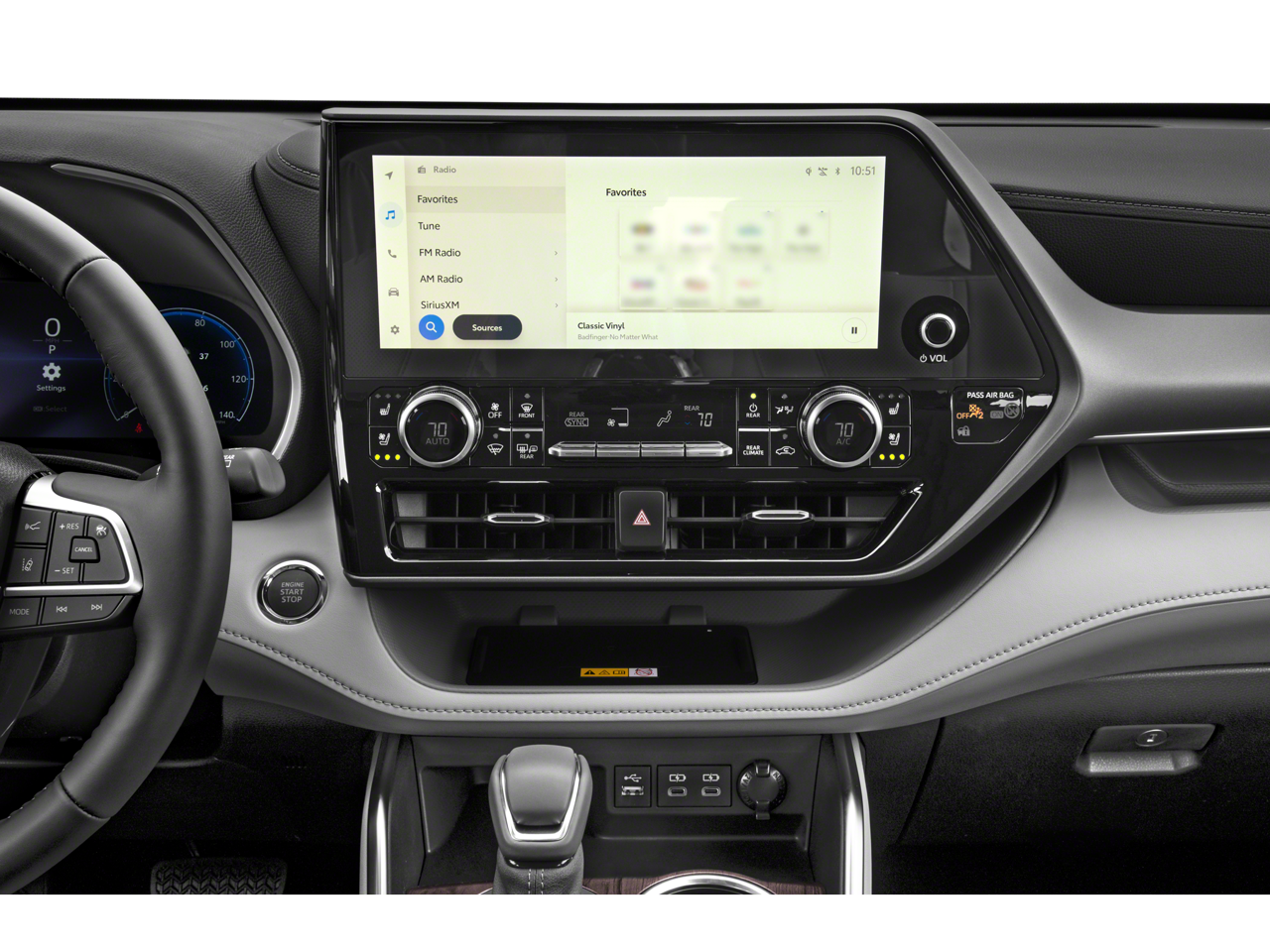 This 2026 Toyota Highlander comes nicely equipped with AWD, 3rd row seats: split-bench, 4-Wheel Disc Brakes, ABS brakes, Air Conditioning, Alloy wheels, AM/FM radio: SiriusXM, Apple CarPlay/Android Auto, Auto High-beam Headlights, Auto-dimming Rear-View mirror, Automatic temperature control, Brake assist, Bumpers: body-color, Carpeted Floor Mats/Carpet Cargo Mat, Delay-off headlights, Driver door bin, Driver vanity mirror, Dual front impact airbags, Dual front side impact airbags, Electronic Stability Control, Emergency communication system: Safety Connect (up to 10-year trial subscription), Exterior Parking Camera Rear, Four wheel independent suspension, Front anti-roll bar, Front Bucket Seats, Front Center Armrest, Front dual zone A/C, Front fog lights, Front reading lights, Fully automatic headlights, Garage door transmitter: HomeLink, Heated door mirrors, Heated front seats, Illuminated entry, Knee airbag, Leather Shift Knob, Leather steering wheel, Low tire pressure warning, Occupant sensing airbag, Outside temperature display, Overhead airbag, Overhead console, Panic alarm, Passenger door bin, Passenger vanity mirror, Power door mirrors, Power driver seat, Power Liftgate, Power moonroof, Power passenger seat, Power steering, Power windows, Rear air conditioning, Rear anti-roll bar, Rear reading lights, Rear window defroster, Rear window wiper, Reclining 3rd row seat, Remote keyless entry, Security system, Speed control, Speed-sensing steering, Split folding rear seat, Spoiler, Steering wheel mounted audio controls, Tachometer, Telescoping steering wheel, Tilt steering wheel, Traction control, Trip computer, Turn signal indicator mirrors, and Variably intermittent wipers.