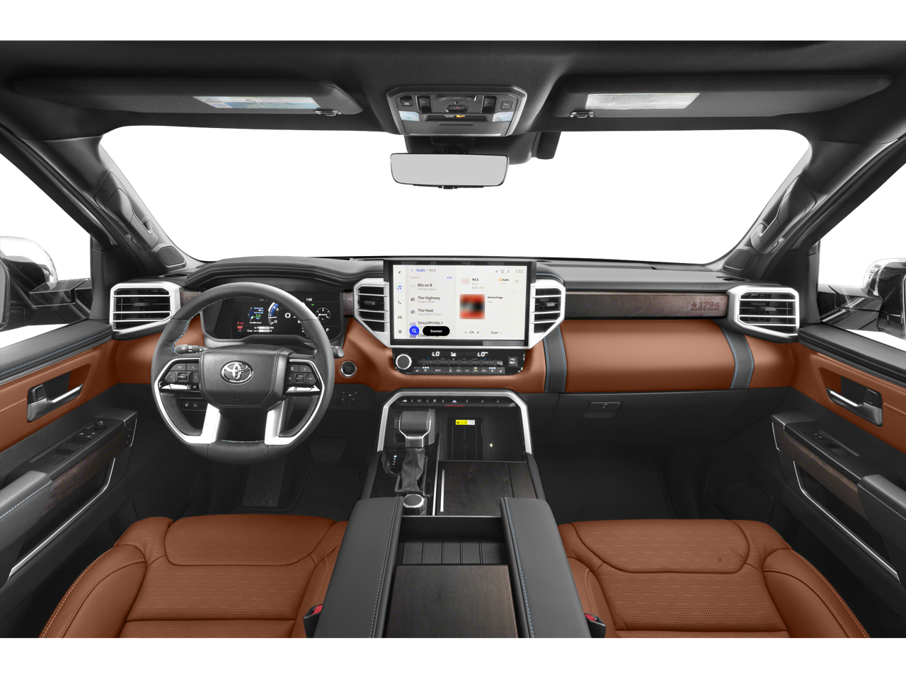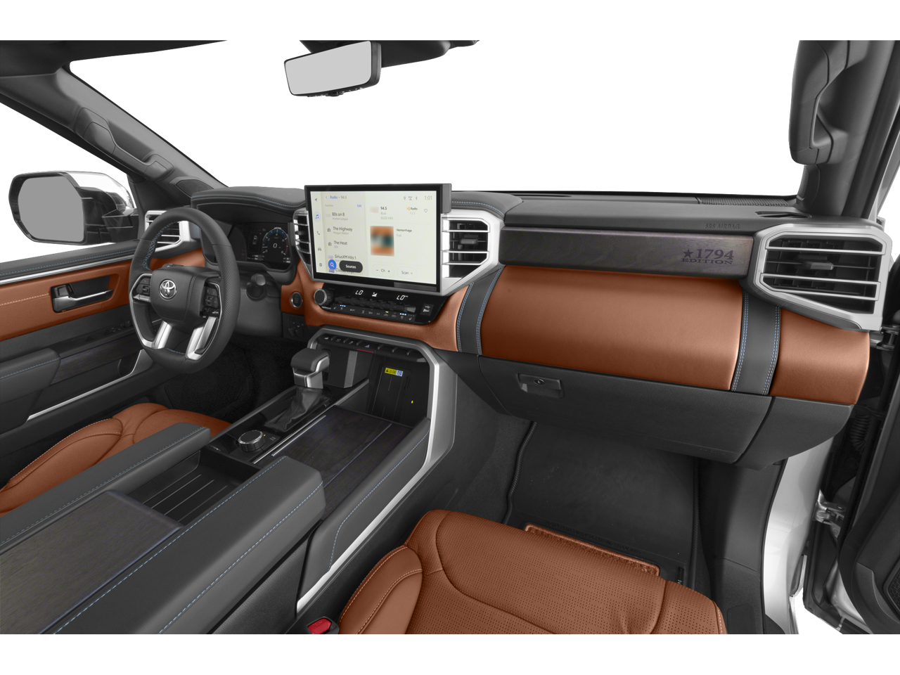 This 2026 Toyota Tundra 4WD comes nicely equipped with 1794 Grade Package (Chrome Exhaust Tail Pipe & Diffuser), 10-Way Power Adjustable Heated and Ventilated Front Seats, 12 Speakers, 3.31 Axle Ratio, 4-Wheel Disc Brakes, ABS brakes, Air Conditioning, Alloy wheels, AM/FM radio: SiriusXM, Apple CarPlay/Android Auto, Auto High-beam Headlights, Auto-dimming door mirrors, Auto-dimming Rear-View mirror, Automatic temperature control, Blind Spot Monitor, Brake assist, Bumpers: body-color, Chrome Plated Power Folding Outside Mirrors, Compass, Delay-off headlights, Driver door bin, Driver vanity mirror, Dual front impact airbags, Dual front side impact airbags, Electronic Stability Control, Emergency communication system: Safety Connect (up to 10-year trial subscription), Exterior Parking Camera Rear, Front anti-roll bar, Front Bucket Seats, Front Center Armrest, Front dual zone A/C, Front fog lights, Front reading lights, Front wheel independent suspension, Fully automatic headlights, Garage door transmitter: HomeLink, Head Up Display (HUD), Heated door mirrors, Heated front seats, Heated rear seats, Heated steering wheel, Illuminated entry, Knee airbag, Leather Shift Knob, Leather steering wheel, Low tire pressure warning, Memory seat, Multi-Terrain Back Monitor, Navigation system: Drive Connect Cloud Navigation (1-year trial subscription), Occupant sensing airbag, Outside temperature display, Overhead airbag, Overhead console, Panic alarm, Panoramic View Back Monitor, Passenger door bin, Passenger vanity mirror, Power door mirrors, Power driver seat, Power moonroof, Power passenger seat, Power Running Boards, Power steering, Power windows, Premium Leather Seat Trim, Radio data system, Radio: Premium Audio, Rain sensing wipers, Rear reading lights, Rear seat center armrest, Rear step bumper, Rear window defroster, Remote keyless entry, Safety Connect, Security system, Speed control, Speed-sensing steering, Speed-Sensitive Wipers, Split folding rear seat, Steering wheel memory, Steering wheel mounted audio controls, Tachometer, Telescoping steering wheel, Tilt steering wheel, Traction control, Trip computer, Turn signal indicator mirrors, Variably intermittent wipers, Ventilated front seats, Ventilated rear seats, Voltmeter, Wheel Locks, and Wheels: 20 Machined Finish Alloy.